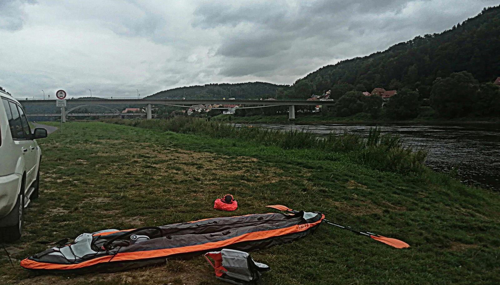 Samochód zaparkowałem na darmowym publicznym parkingu koło przystanku kolejowego w Bad Schandau, jednak zanim to nastąpiło trzeba było na parę minut dotrzeć na brzeg rzeki, napompować kajak, zostawić go w tym miejscu, szybko obrócić na parking i biegusiem wrócić nad wodę.
