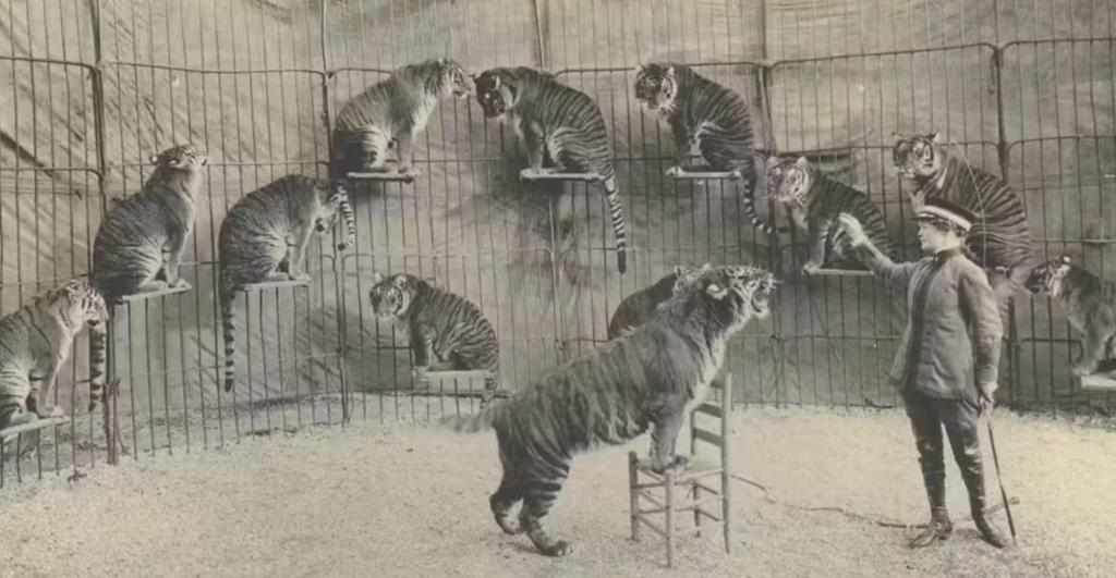 „Drzwi zsypu otwierają się, gdy trzaskam z bicza i krzyczę: »Niech wyjdą!«. Pręgowane koty wyskakują z nich, warcząc i rycząc, skacząc na siebie nawzajem lub na mnie. To niezrównany dreszczyk emocji, a życie bez niego nie jest dla mnie warte zachodu”.