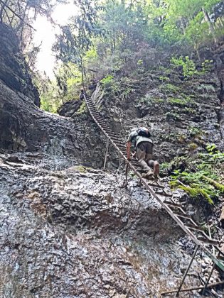 Na szczęście Wielki Sokół ma miejsca, które wynagradzają wysiłek i zniechęcenie. To przepięknie umiejscowione wodospady, które w połączeniu z nabitymi w skałę stopniami, drabinami i kładkami daje tę bajkowo – dziecięcą radochę ze znalezienia skarbu piratów. No tak to działa.